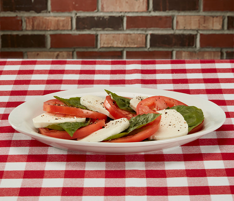 Slices of fresh mozzarella, tomatoes and fresh basil, drizzled with extra virgin olive oil.