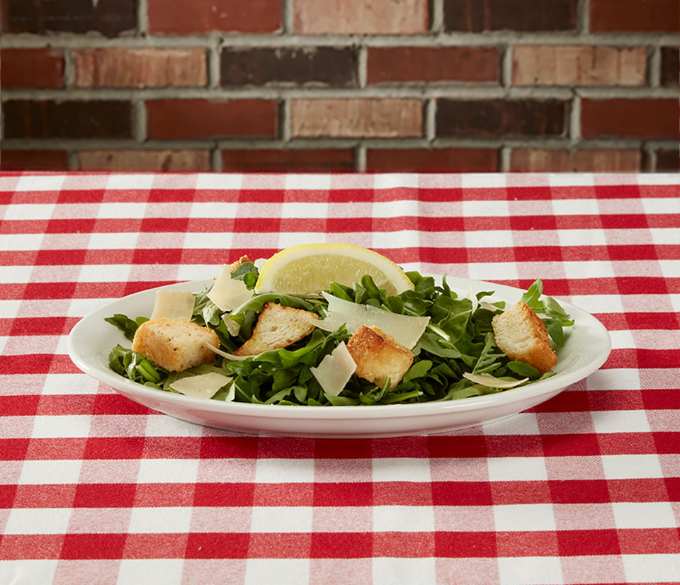 Arugula, shaved Italian cheese, coal oven baked croutons and lemon vinaigrette garnished with lemon wedges.