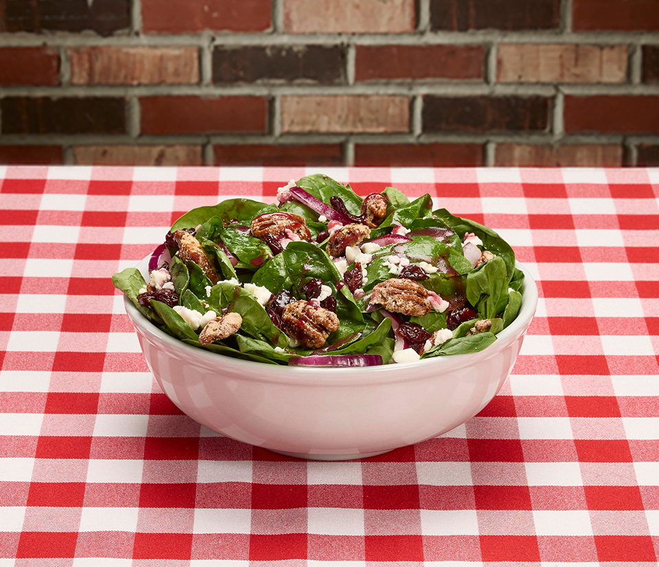 Spinach, dried cherries, candied pecans and red onion tossed with a black cherry vinaigrette and topped with goat cheese.