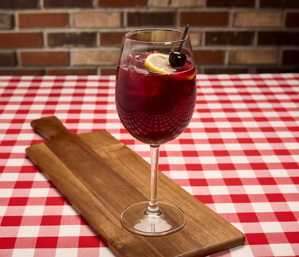 Aperol, black cherry purée, lemon juice, La Marca Prosecco, Luxardo cherry.