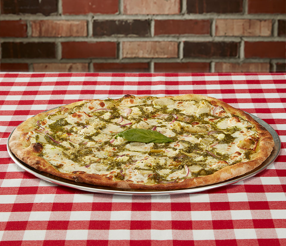 Fresh mozzarella and basil pesto sauce drizzle and garnish of basil. Topped with our signature cheese and spice blend. (nut free)