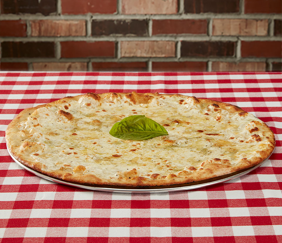 Mozzarella, asiago, parmesan, pecorino romano & gorgonzola cheese and garnish of basil.