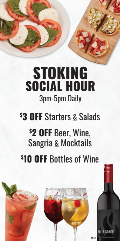 As the oven heats up, so do the deals! Join us for Stoking Social Hour daily from 3-5 pm and enjoy $3 off starters, $2 off beer & wine, plus more great specials. See full menu.