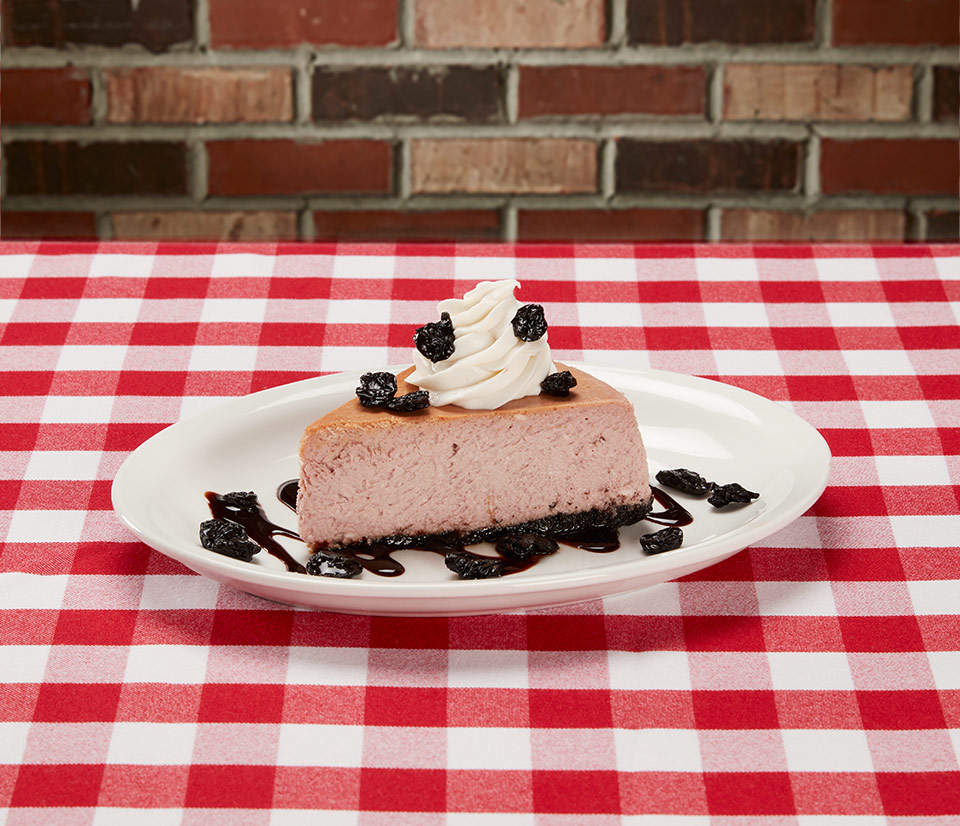 Black cherry cheesecake with Oreo® Cookie crust, topped with whipped cream and dried cherries.