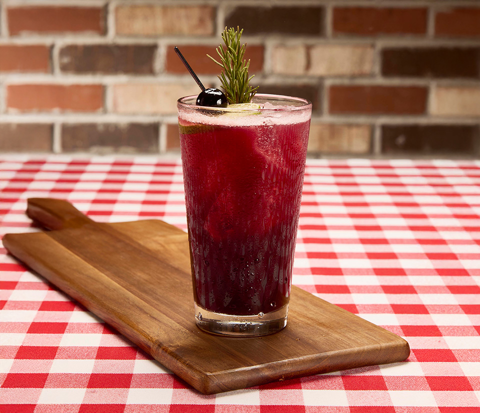 Cranberry juice, black cherry purée, lime juice, soda, Luxardo cherry, rosemary. Non-alcoholic.